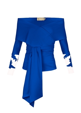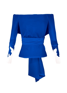 Bluza albastra cu decolteu pe umeri si maneci cu broderie Rimini
