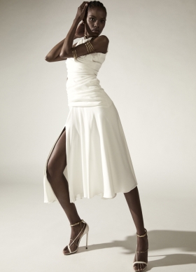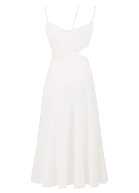 Rochie alba midi de cununie cu drapaje si decupaje Canto