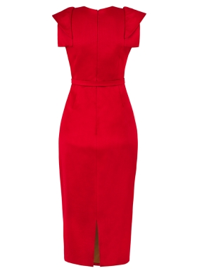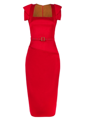 Rochie birou midi conica din lana rosie cu drapaje si decolteu patrat Savoy