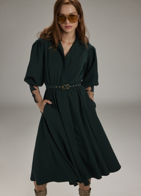 Rochie camasa midi verde cu croiala evazata si broderie pe maneci Azalea