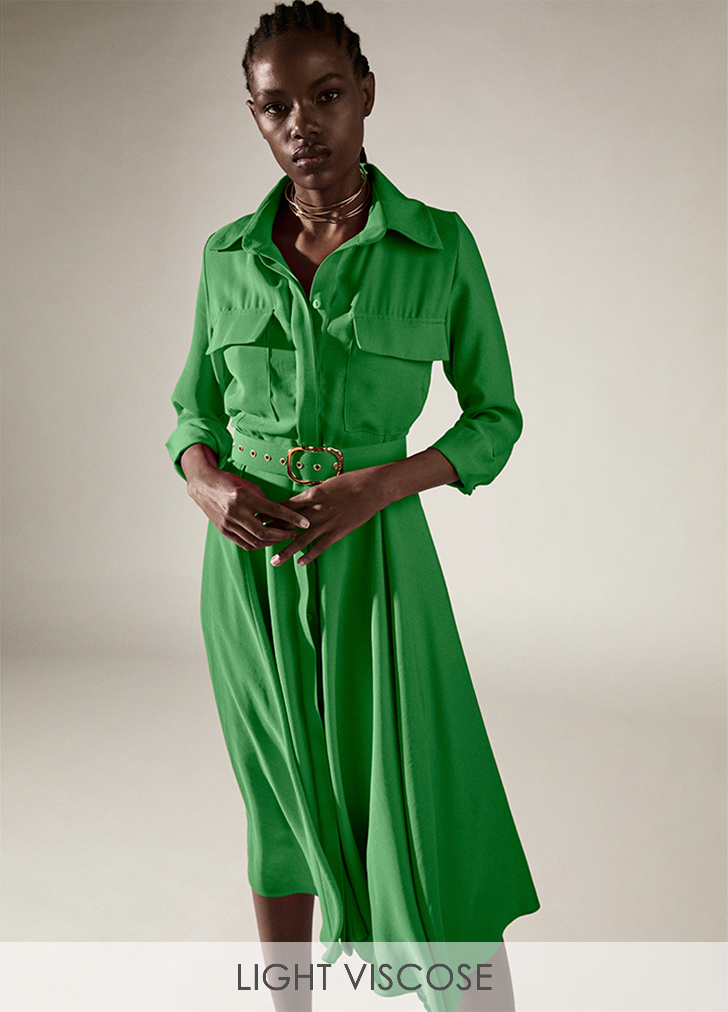 Rochie camasa midi verde cu fusta ampla si curea asortata Patty