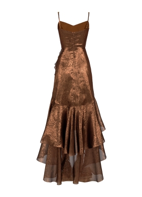 Rochie cocktail maxi metalica din voal de matase cu decolteu in V si curea asortata Enyo