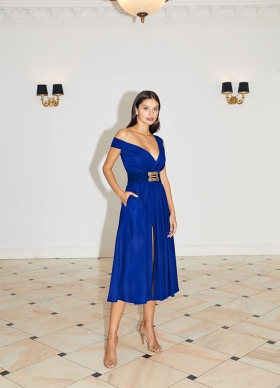 Rochie cocktail midi albastra cu buzunare si decolteu asimetric Firenze