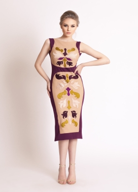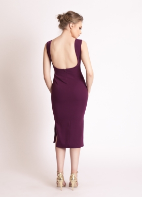 Rochie cocktail midi conica mov cu spatele gol si tulle cu broderii Grapevine