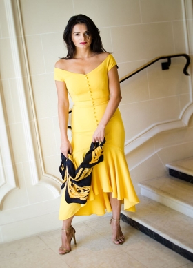 Rochie cocktail midi galbena cu decolteu pe umeri si fusta asimetrica cu volane Rialto