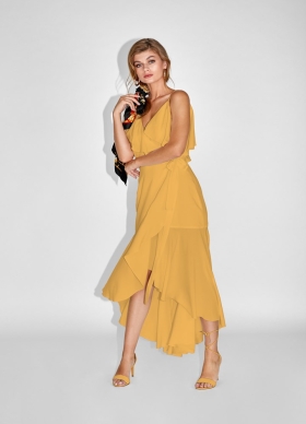 Rochie cocktail midi galbena din vascoza cu decolteu in V si volane Riviera