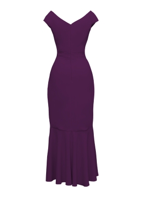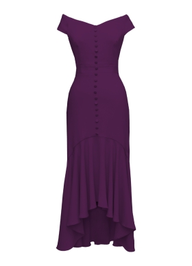 Rochie cocktail midi mov cu decolteu pe umeri si fusta asimetrica Rialto