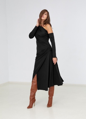 Rochie cocktail midi neagra cu fusta asimetrica si un umar decoltat Melrose