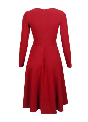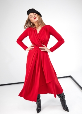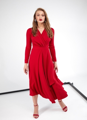 Rochie cocktail midi rosie cu drapaje si maneci lungi Sway