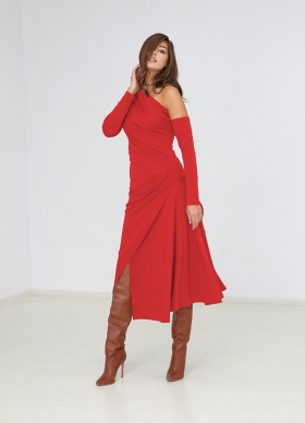Rochie cocktail midi rosie cu fusta asimetrica si un umar decoltat Melrose