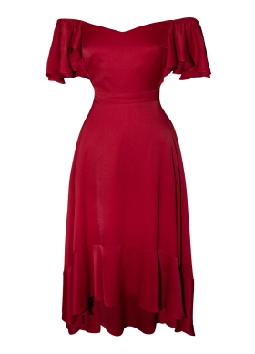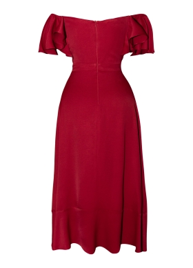 Rochie cocktail midi rosie din vascoza cu decolteu pe umeri si curea asortata Genoa
