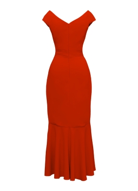 Rochie cocktail midi rosu corai cu decolteu pe umeri si fusta asimetrica Rialto