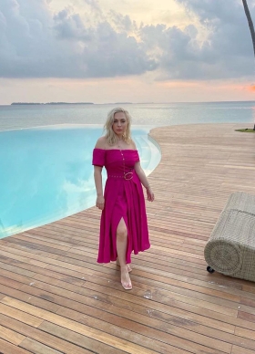 Rochie cocktail midi roz din in cu decolteu cu bretele dupa gat Chimera