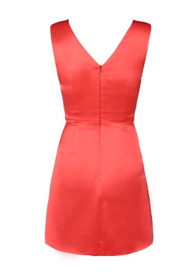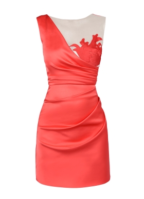 Rochie cocktail scurta corai din satin cu decolteu pe un umar si broderii Rhea