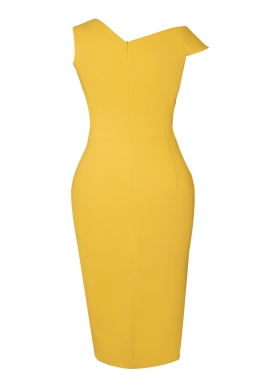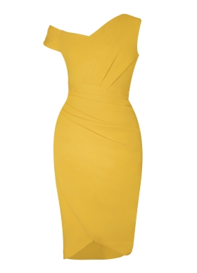Rochie cocktail scurta galbena cu drapaje si decolteu asimetric Bellini