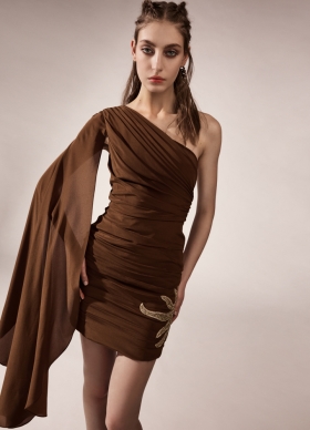 Rochie cocktail scurta maro din matase naturala cu drapaje si broderii Zest