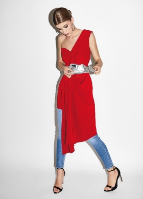 Rochie cocktail scurta rosie cu drapaje asimetrice Rave