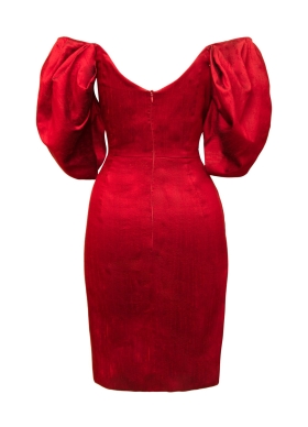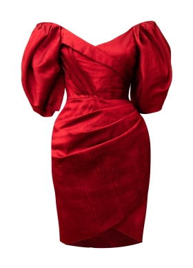 Rochie cocktail scurta rosie din tafta de matase cu drapaje asimetrice Como