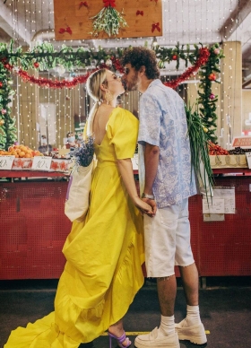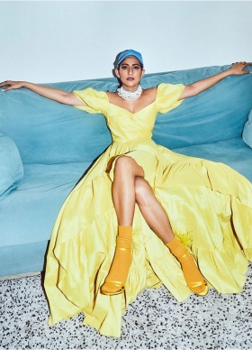 Rochie de seara galbena din tafta de matase cu fusta asimetrica si decolteu pe umeri Sole