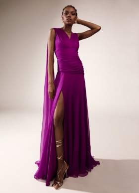 Rochie de seara lunga mov din voal de matase naturala cu decolteu in V si drapaje Nymph