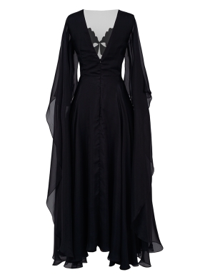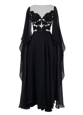 Rochie de seara midi de matase naturala neagra cu maneci capa si broderie pe bust Novum