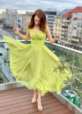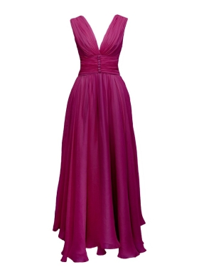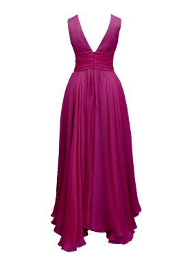 Rochie de seara midi magenta din voal de matase naturala cu decolteu in V Elysee