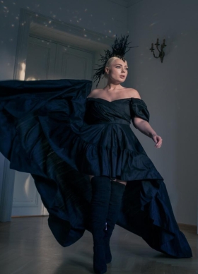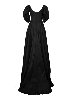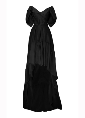Rochie de seara neagra din tafta de matase cu fusta asimetrica si decolteu pe umeri Sole