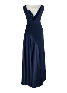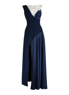 Rochie lunga de seara bleumarin cu decolteu asimetric si slit pe un picior Glow