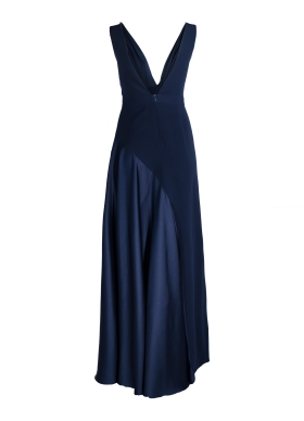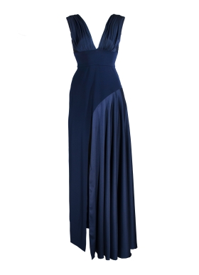 Rochie lunga de seara bleumarin din matase cu decolteu in V si slit pe picior Diva