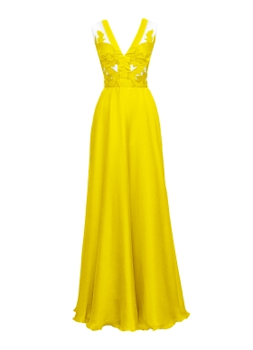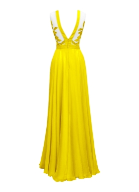 Rochie lunga de seara galbena din voal de matase cu decolteu in V si broderii Felicity