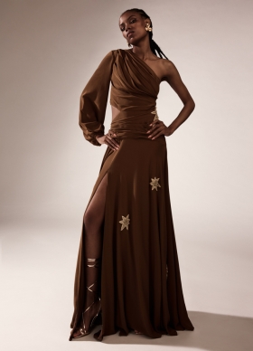 Rochie lunga de seara maro din matase naturala cu o maneca lunga ampla si broderii Glim