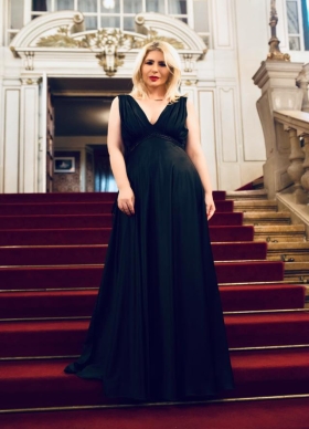 Rochie lunga de seara neagra din matase cu decolteu in V si detaliu crosetat in talie Gala