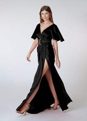 Rochie lunga de seara neagra din satin cu drapaje si maneci fluture Opera