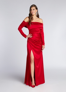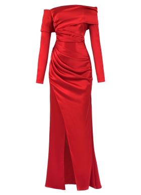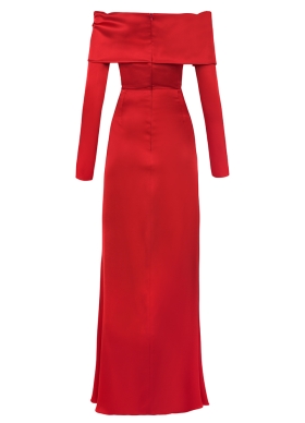 Rochie lunga de seara rosie din satin cu decolteu pe umeri si fusta cu slit pe picior Dimora