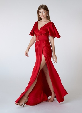 Rochie lunga de seara rosie din satin cu drapaje si maneci fluture Opera
