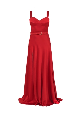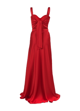 Rochie lunga de seara rosie din satin cu funda ajustabila si curea asortata Electra