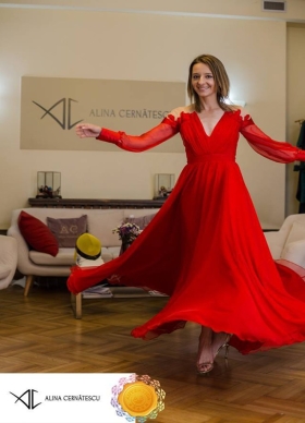 Rochie lunga de seara rosie din voal de matase cu maneci lungi si broderii Divine