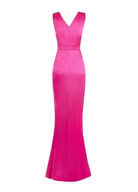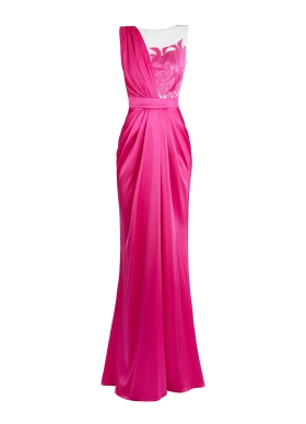 Rochie lunga de seara roz din satin cu drapaje si decolteu asimetric cu broderii Stream