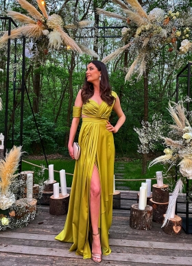Rochie lunga de seara verde cu drapaje si decolteu asimetric Trevi
