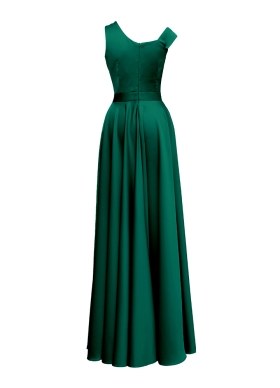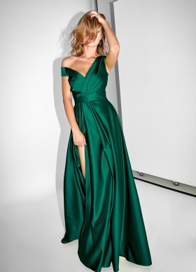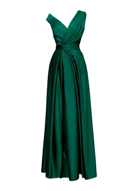 Rochie lunga de seara verde inchis cu drapaje si decolteu asimetric Delirium