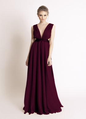 Rochie lunga de seara visinie din voal de matase cu spatele gol si broderii Wing