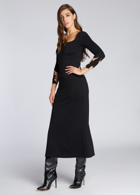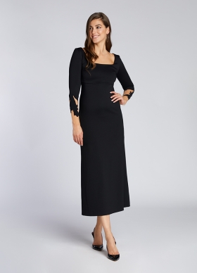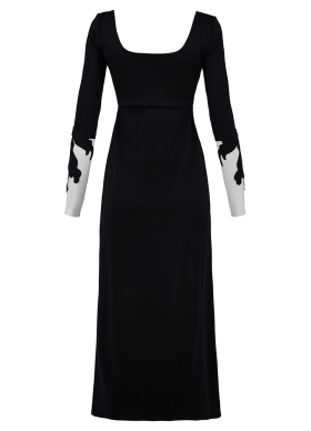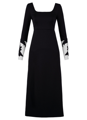Rochie lunga neagra cu decolteu patrat si maneci lungi cu broderie Zexe