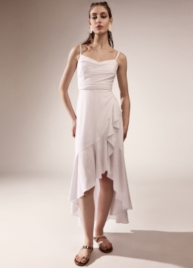 Rochie midi alba din in cu bretele ajustabile si fusta asimetrica cu volane Volla