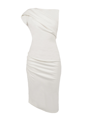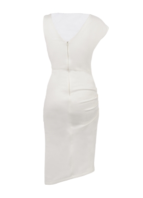 Rochie midi alba din vascoza cu drapaje si fusta asimetrica Love