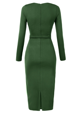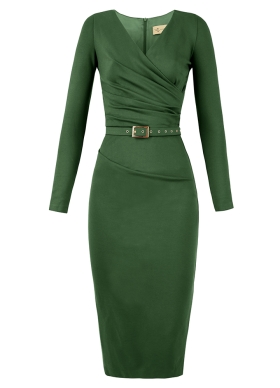 Rochie midi conica verde cu model drapat si decolteu in V Merlot