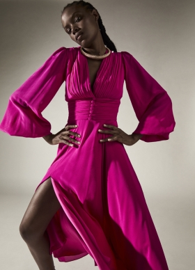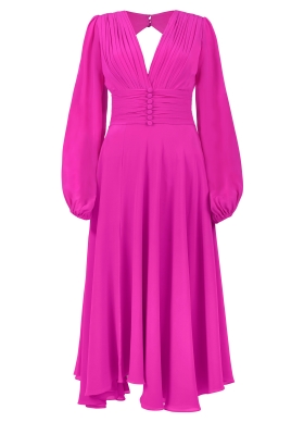 Rochie midi din matase cu talie marcata si decolteu in V Flora