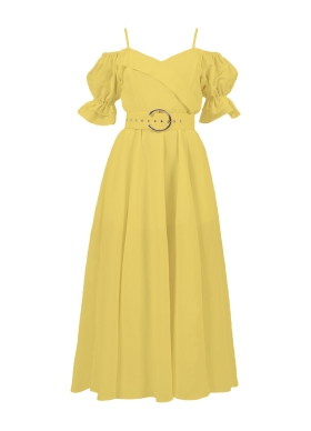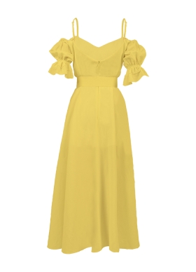 Rochie midi galbena din in cu bretele ajustabile si maneci bufante Acacia