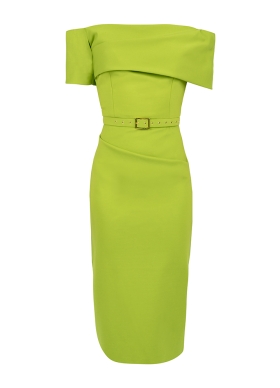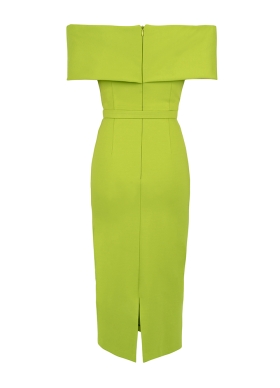 Rochie midi lime din vascoza cu fusta conica si decolteu pe umeri Oxford