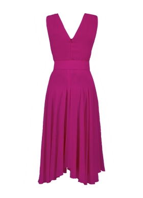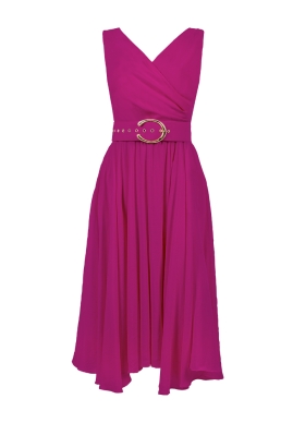 Rochie midi magenta din vascoza cu drapaje si decolteu in V Angel
