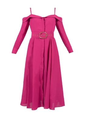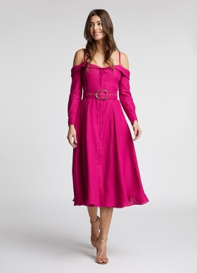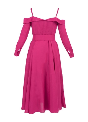 Rochie midi magenta din vascoza si in cu decolteu pe umeri si bretele ajustabile Shard
